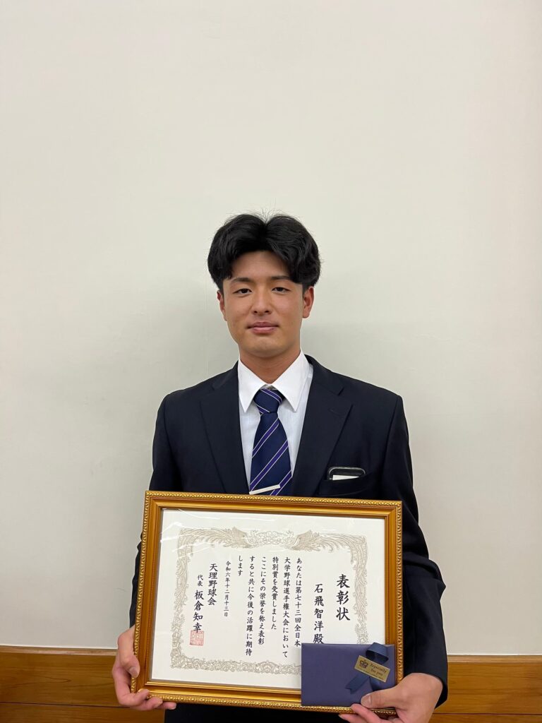 ◎石飛選手は全日本大学野球選手権大会で新記録タイとなる7打席連続安打、1イニング2安打、1試合3本の二塁打の記録を樹立